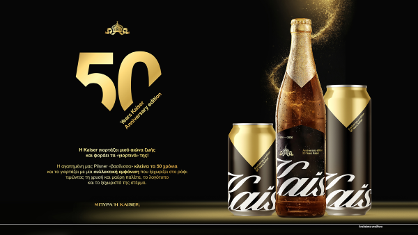 Η Kaiser συμπληρώνει φέτος μισό αιώνα παρουσίας στην ελληνική αγορά μπύρας και το γιορτάζει. Με μια συλλεκτική επετειακή εμφάνιση, σχεδιασμένη ειδικά για την περίσταση, που χαρακτηρίζεται από τη μαύρη και χρυσή παλέτα, το εμβληματικό λογότυπο και το ξεχωριστό στέμμα στο επίκεντρο, η αγαπημένη Pilsner βασίλισσα τιμά τη διαδρομή της, παραμένοντας πιστή στην υψηλή ποιότητά της και στο διαχρονικό της χαρακτήρα.