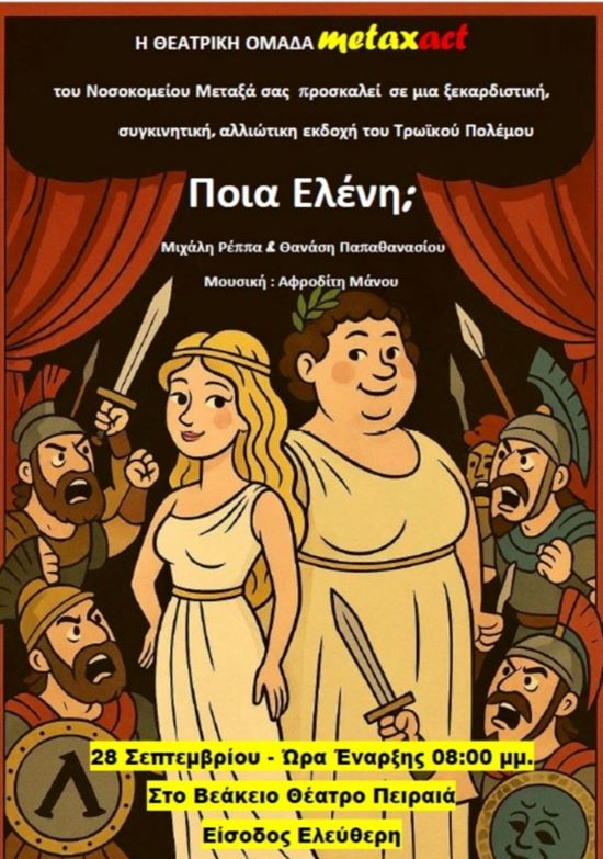 Η θεατρική ομάδα του νοσοκομείου ΜΕΤΑΞΑ παρουσιάζει, με ελεύθερη είσοδο, το Σάββατο 28 Σεπτεμβρίου και ώρα 20:00 την κωμωδία «Ποια Ελένη;» των Ρέππα- Παπαθανασίου, στο Βεάκειο Θέατρο.
