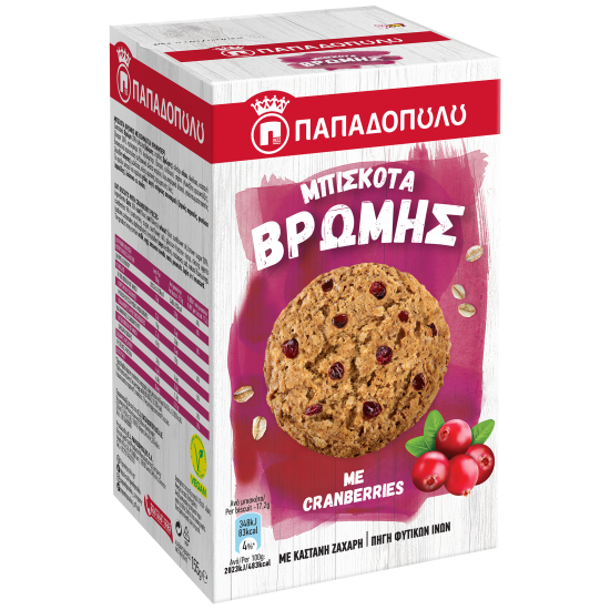 Τα νέα Μπισκότα Βρώμης Παπαδοπούλου με Cranberries έρχονται να κερδίσουν την προτίμησή μας με μία σειρά από οφέλη: αποτελούν πηγή φυτικών ινών και περιέχουν καστανή ζάχαρη και φυσικές αρωματικές ύλες!