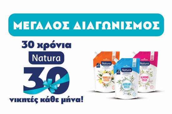 Μετά την ανανέωση της εικόνας, τον εμπλουτισμό με νέα προϊόντα και μια νέα φιλοσοφία, που ανταποκρίνεται ακόμα περισσότερο στις ανάγκες των καταναλωτών, το Natura λανσάρει τον συναρπαστικό διαγωνισμό «30 χρόνια Natura, 30 νικητές κάθε μήνα!».